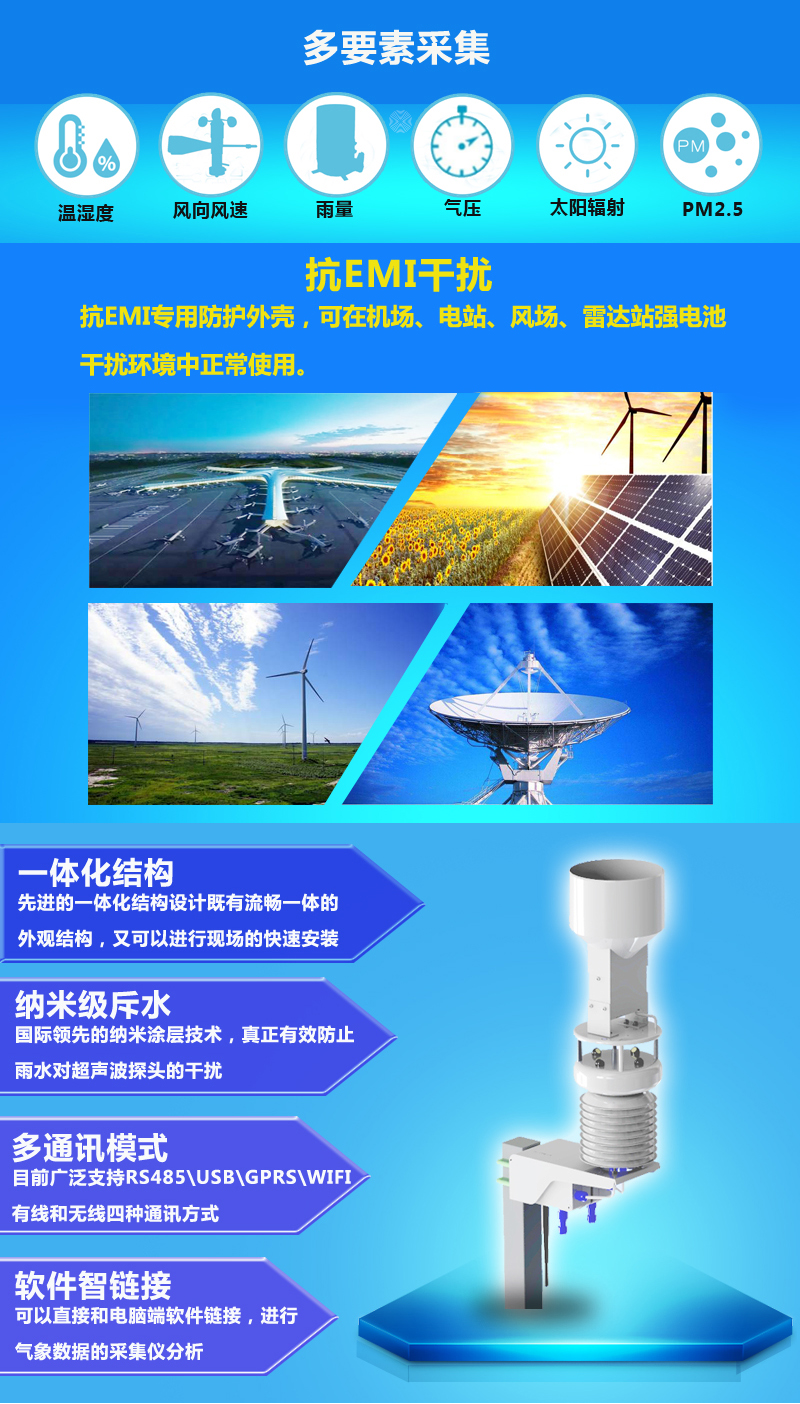 1、輸出2~10個氣象要素: 大氣溫度、環(huán)境濕度、風(fēng)向和風(fēng)速、降雨、氣壓、太陽輻射、PM2.5、土壤溫度、土壤濕度、氣體濃度